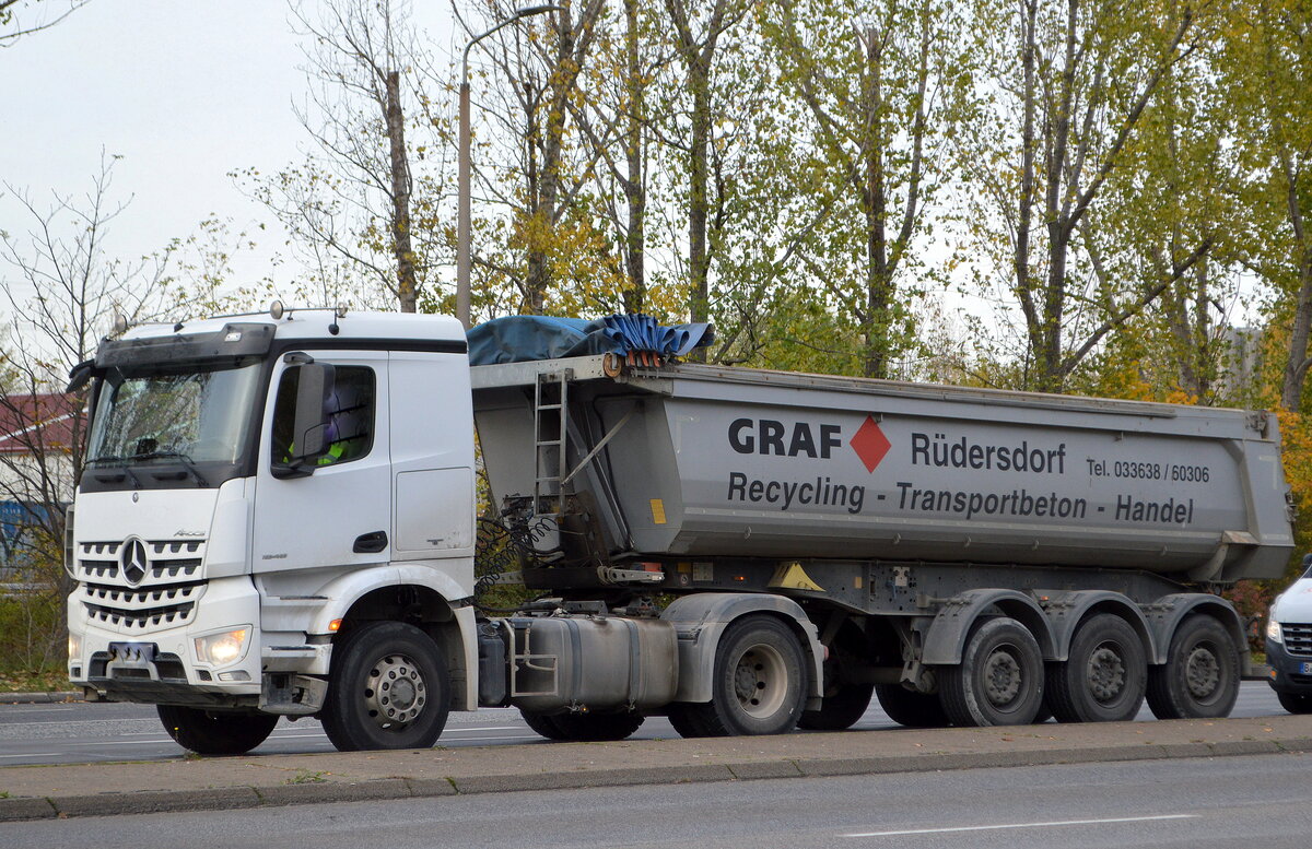 Graf Recycling-Baustoffe GmbH & Co KG mit einem Sattelkipper mit MB AROCS 1848 Zugmaschine am 11.11.22 Berlin Marzahn.