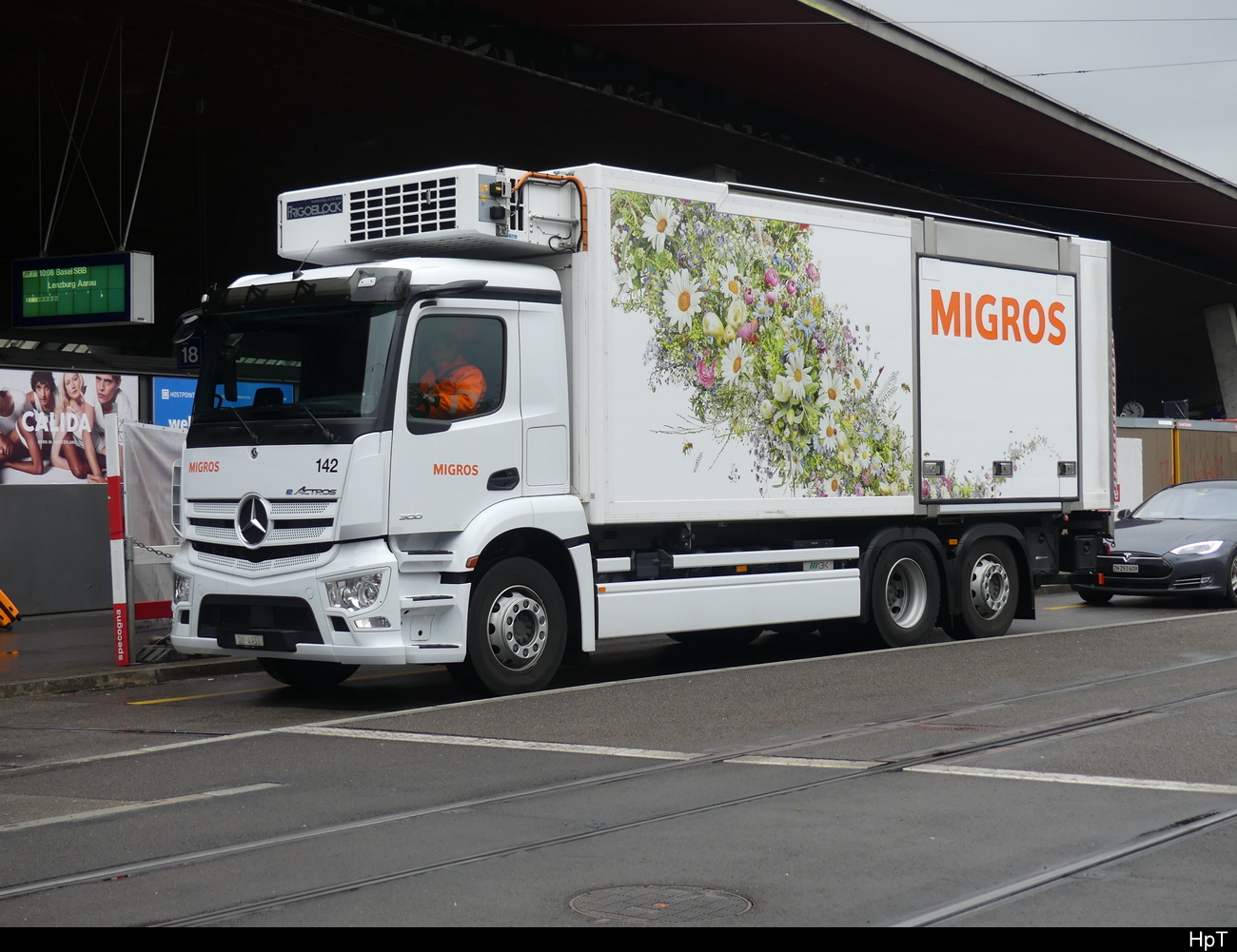 Mercedes Kühllaster unterwegs in der Stadt Zürich am 20.04.2023