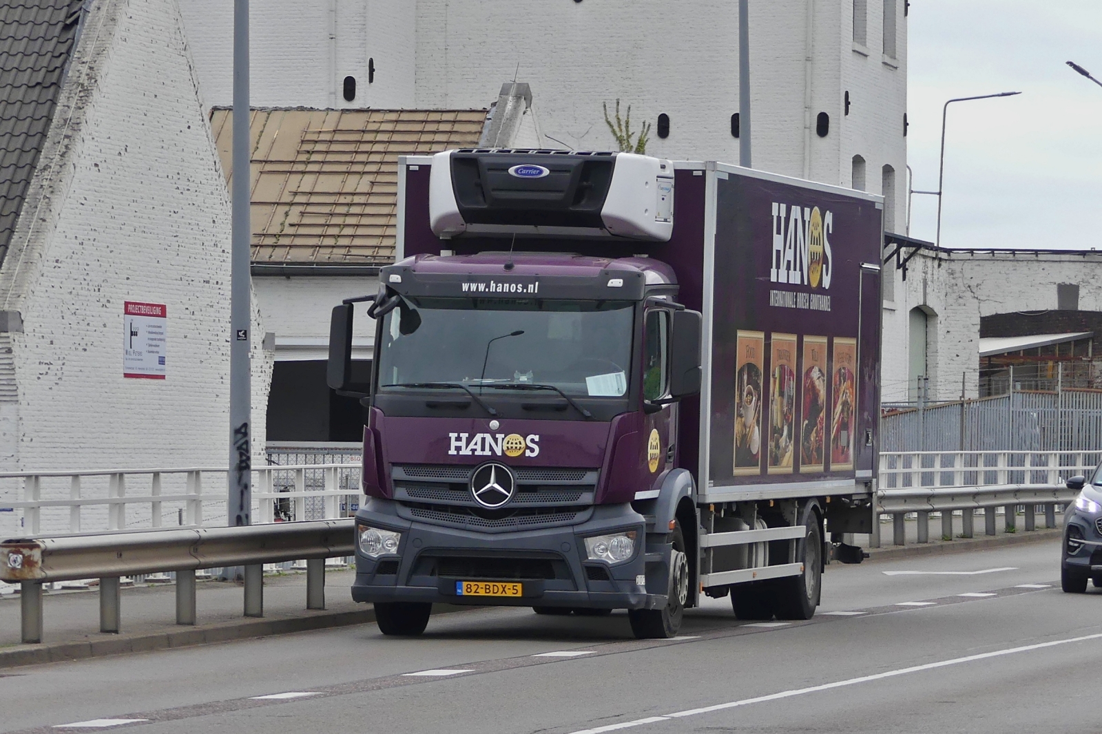 Mercedes Benz Kühllaster fährt am alten Bootshafen in Maastricht vorbei. 04.2024