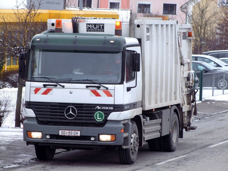 ACTROS1831 mit MüllabfuhrAufbau ist in den Straßen von Schärding/Inn unterwegs; 090130