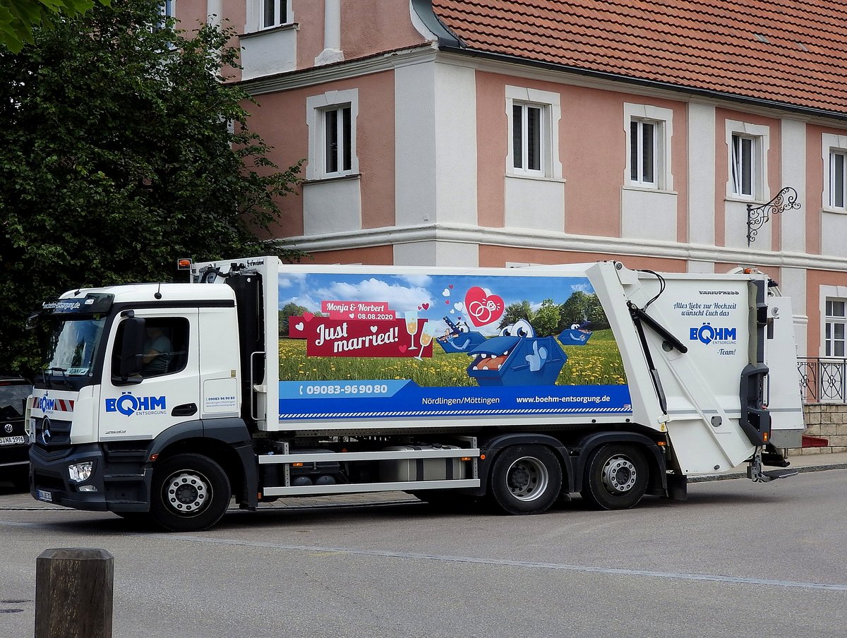 2533,Müllwagenaufbau mit Hochzeitsglückwünschen; ist in Harburg/Schw. auf Einsammeltour; 200814