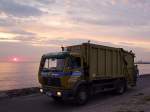 Mercedes Benz Müllentsorgungsfahrzeug, zum Entleeren von Mülltonnen an einer Raststätte unterwegs. 09.2025