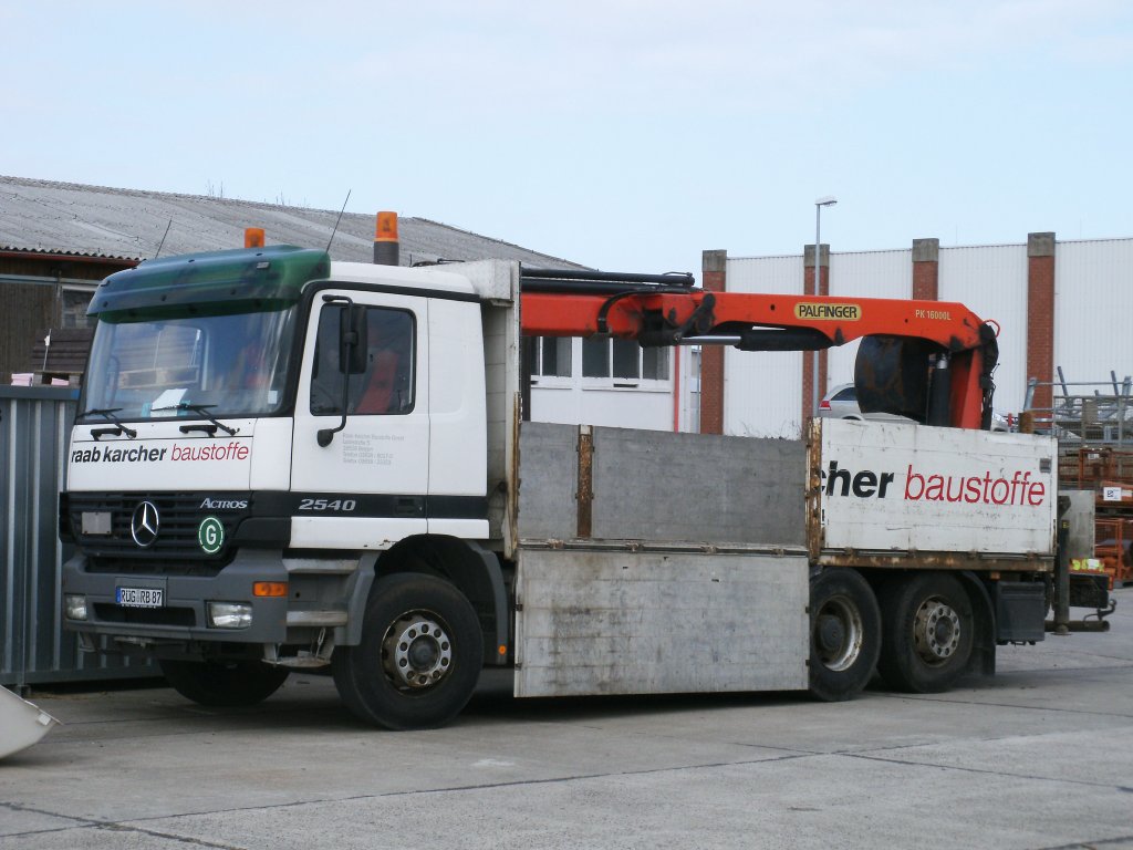Obwohl dieser Mercedes keine Ladung geladen hat,geht dieser im Heck ganz schön in die Knie.Aufgenommen am 11.März 2011 bei einem Baustoffhandel in Bergen/Rügen.