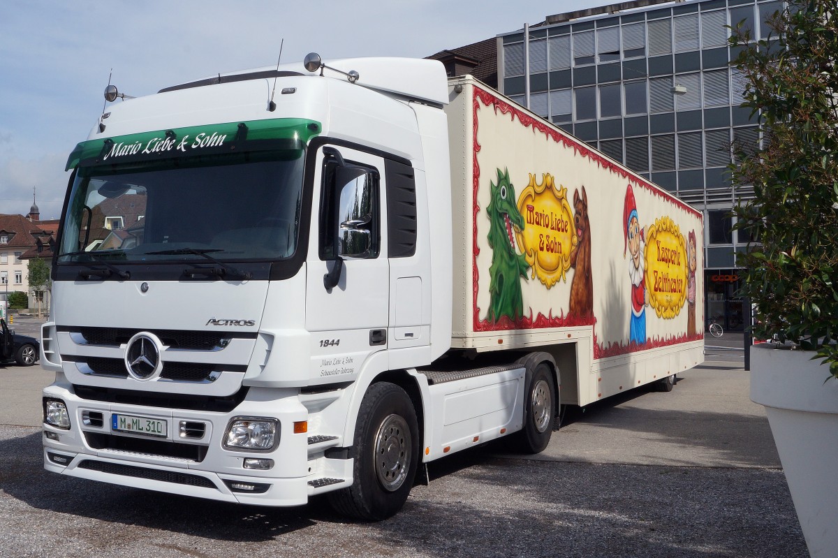 MERCEDES: Mercedes ACTROS 1844 mit KASPERLE ZELTTHEATER unterwegs in Solothurn am 22. Juni 2015.