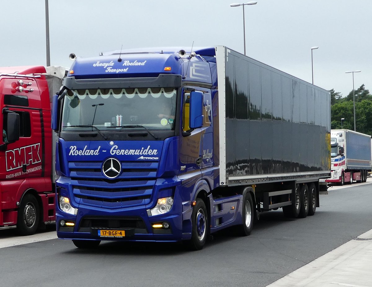 =MB-Sattelzug von ROELAND-GENEMUIDEN" verlässt den Rastplatz an der A 7 im Juli 2018