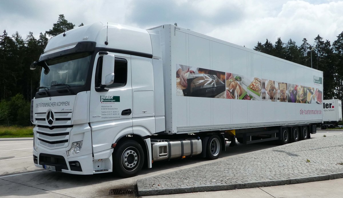 =MB Actros von WEBER-Verpackungen rastet an der A 70 im Juni 2018