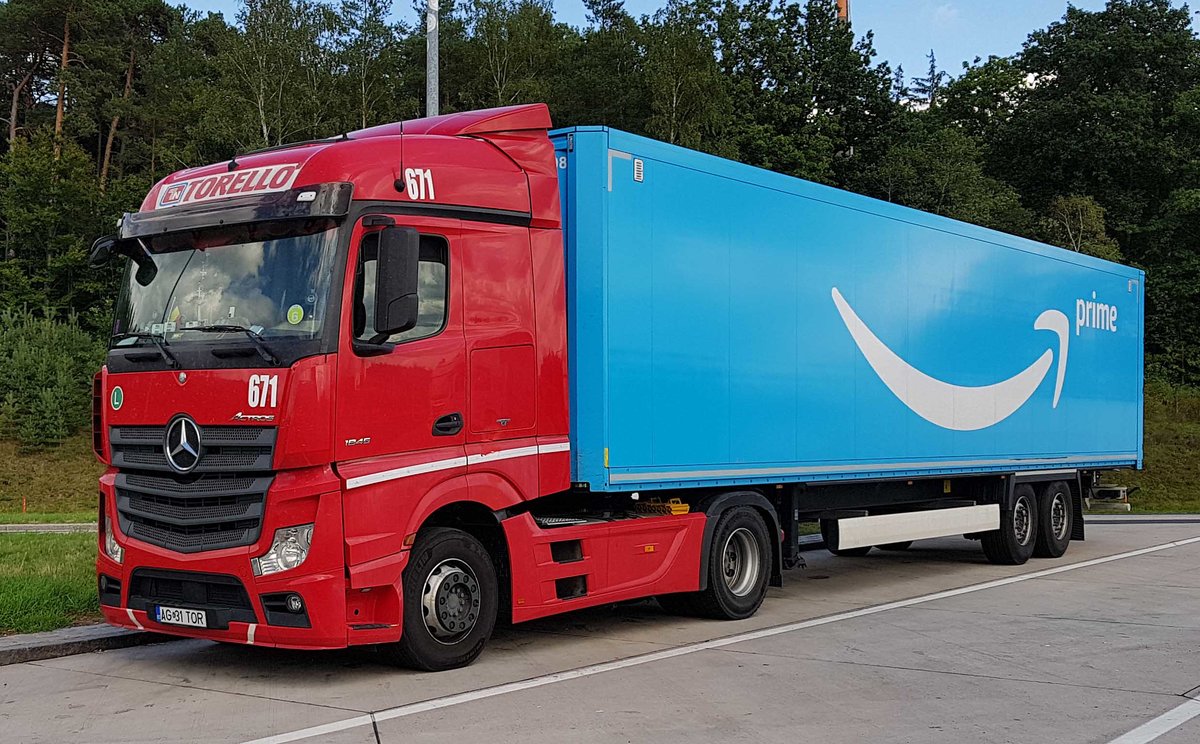 =MB Actros-Sattelzugmaschine von TORELLO mit einem Sattelauflieger von AMAZON PRIME steht auf einem Rastplatz an der A 7, 09-2020
