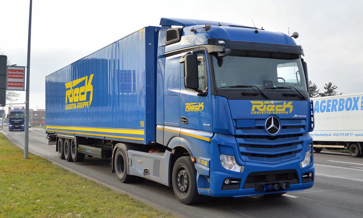 Rieck Logistik Gruppe mit einem Sattelzug mit MB ACTROS 1845 Zugmaschine am 16.12.20 Schönefeld b. Berlin.