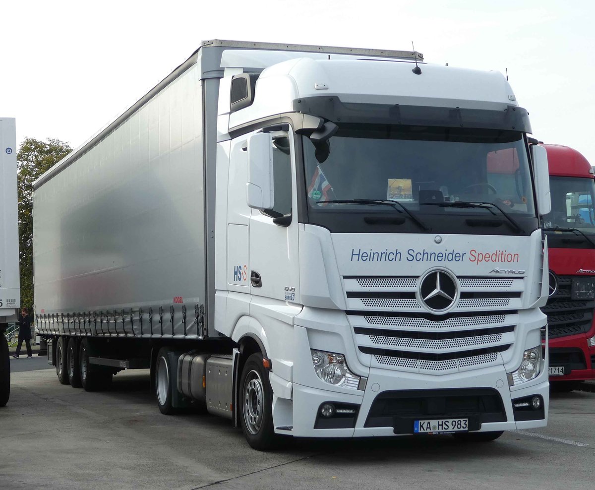 =MB Actros-Sattelzug der HEINRICH SCHNEIDER-Spedition steht auf einem Rastplatz an der A 7, 10-2020