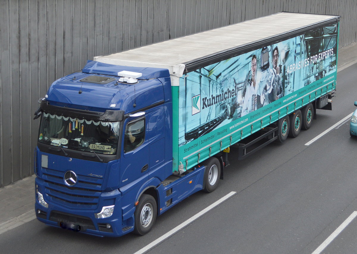 Ein Sattelzug für die Fa. Kuhmichel Abrasiv GmbH mit MB ACTROS 1848 Zugmaschine am 26.04.21 Berliner Stadtautobahn Höhe Knobelsdorffbrücke.