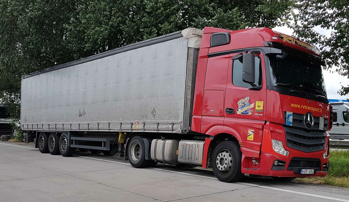 MB Actros-Sattelzug von RV-TRANSPORT aus Litauen rastet an der A 3, 08-2021