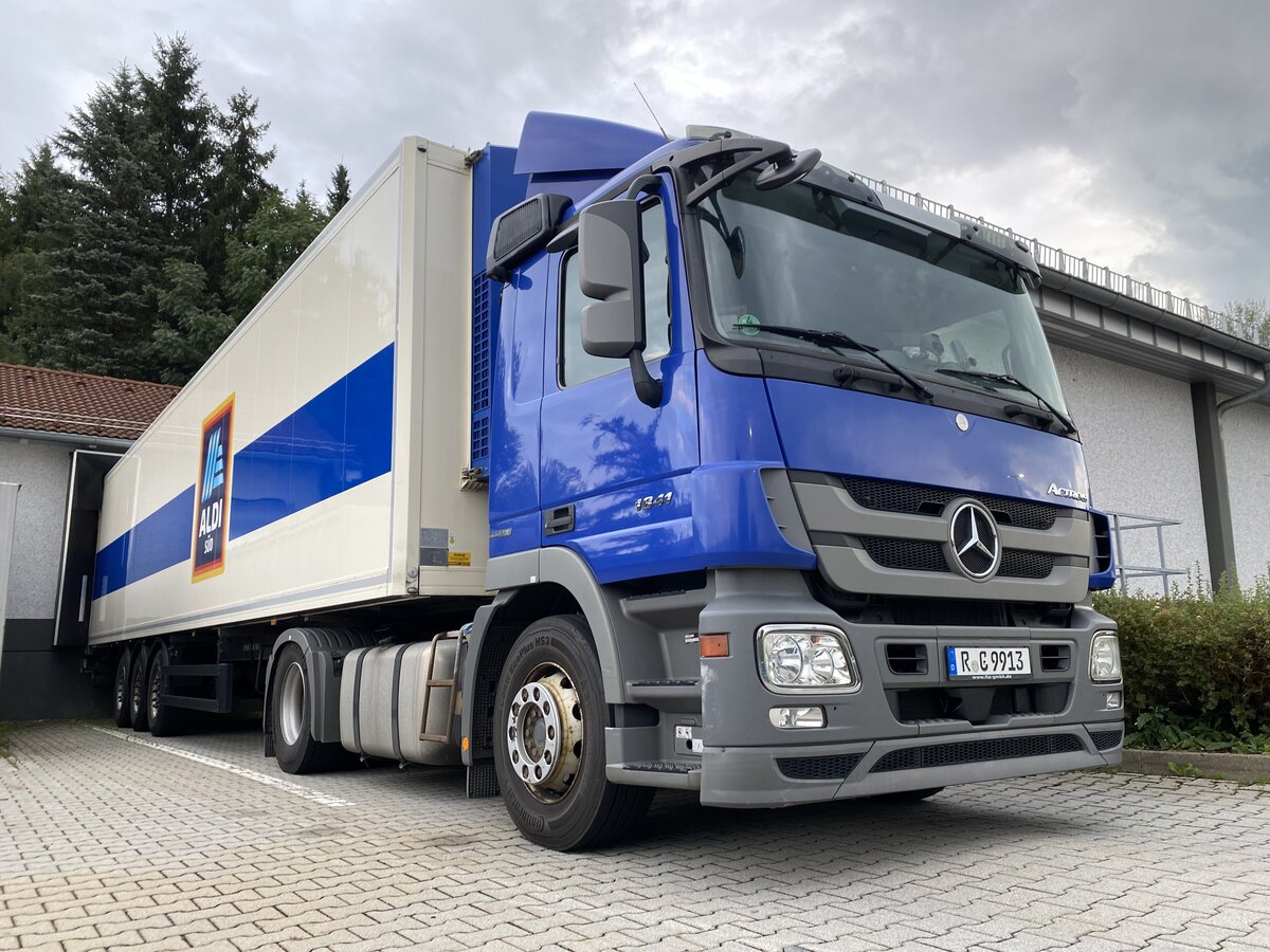 Mercedes - Benz Actros MP2 von Aldi Süd beim beliefern einer Filiale in der Kreisstadt Regen, August 2021