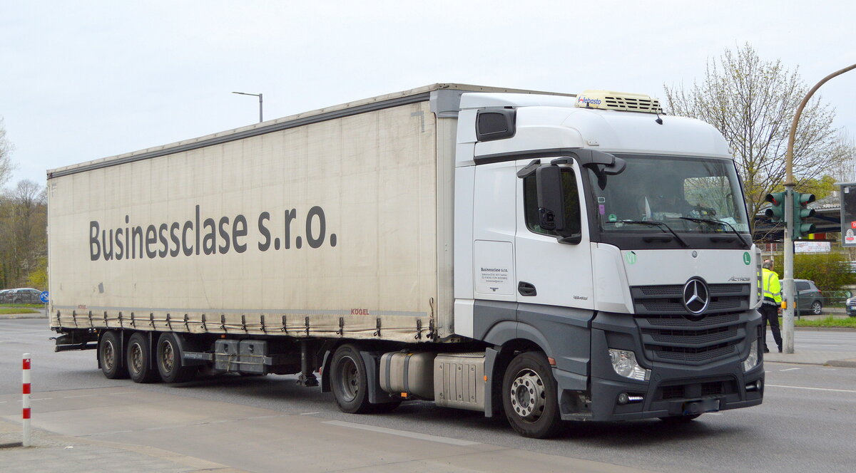 Businessclase s.r.o. Company aus der Slowakei mit einem Sattelzug mit MB ACTROS 1845 Zugmaschine am 14.04.22 Berlin Marzahn.