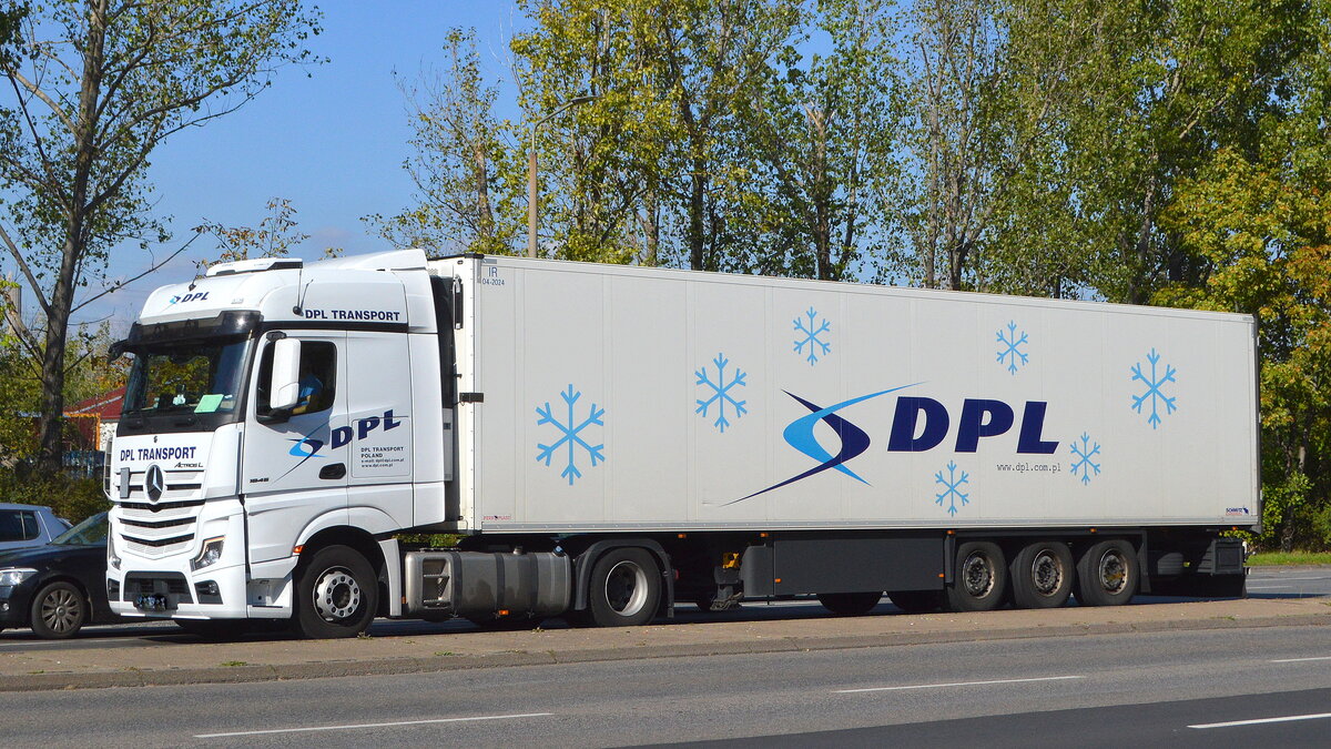 DPL Transport Spedition Sp. Z O.o. aus Polen mit einem Sattelzug mit MB ACTROS L 1845 Zugmaschine und Kühlthermoauflieger am 30.09.22 Berlin Marzahn.