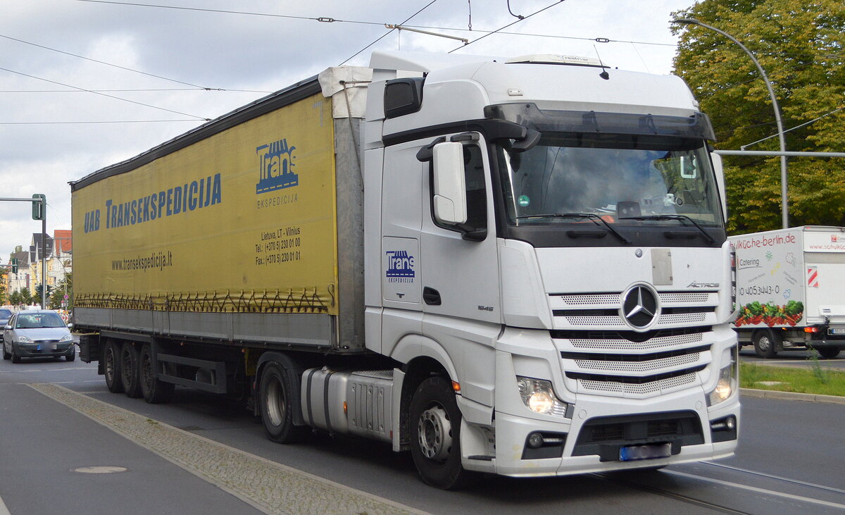 Die Spedition Transekspedicija aus Litauen mit einem Sattelzug mit MB ACTROS 1845 Zugmaschine am 04.10.22 Berlin Karlshorst.