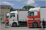 Fahrzeugparade bei K.P. GENUIT (v.l.n.r.): Actros MP2 1846, VOLVO FH12 420PS und ein weiterer Actros MP2 1846.