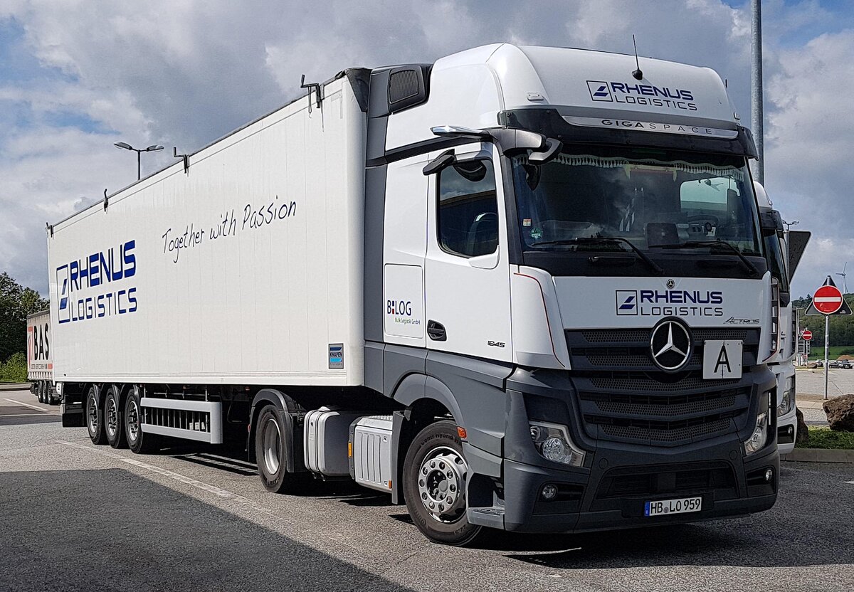 =MB-Sattelzug von RHENUS-Logistics steht auf einem Rastplatz im August 2023