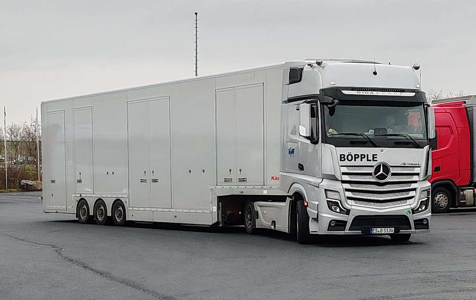 =MB Actros L der Firma BÖPPLE mit einem Sattelauflieger für geschlossene Fahrzeugtransporte, 12-2023