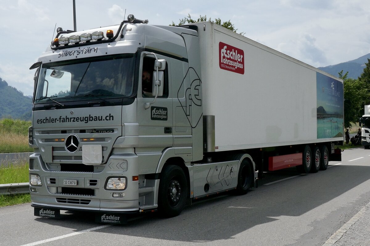 Ein MB Actros Sattelzug von Eschler Fahrzeugbau der am 28.6.24 kurz vor dem Trucker Festival steht in Bönigen.