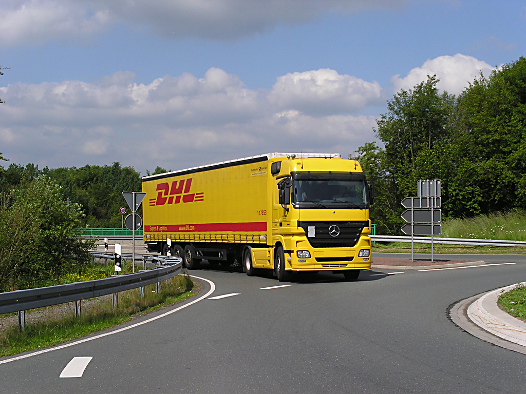 ...Mercedes -ACTROS - Sattelzug mit Planenauflieger von DHL - hier eilt er zur A45