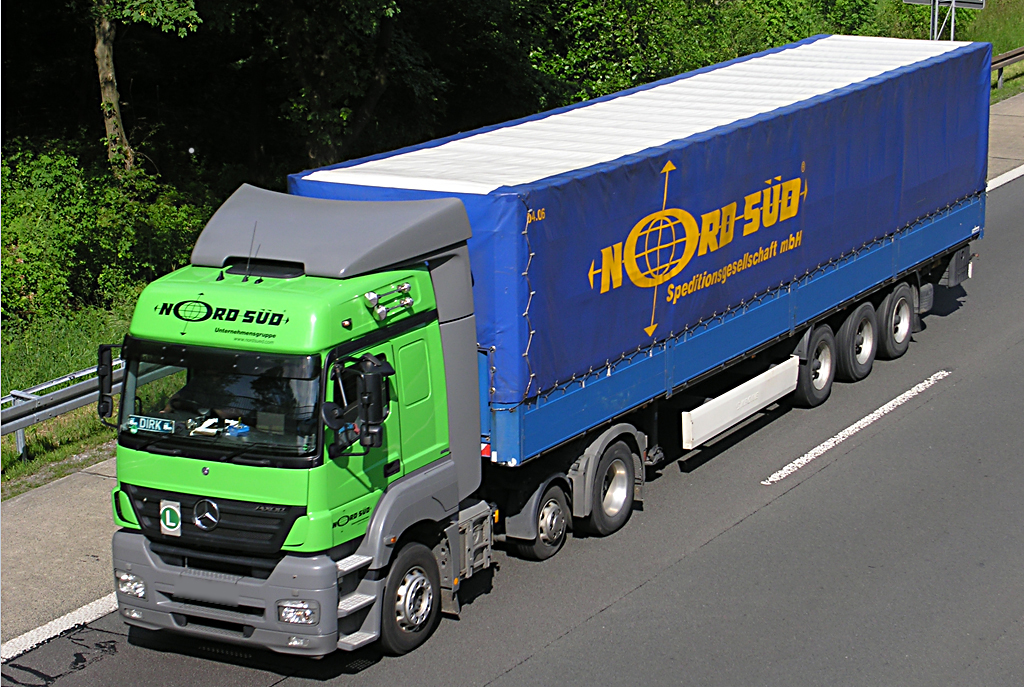 ...Mercedes - AXOR der "NORD-SÜD"-Gruppe, hier mit Planenauflieger auf der A 45 in Richtung Frankfurt -