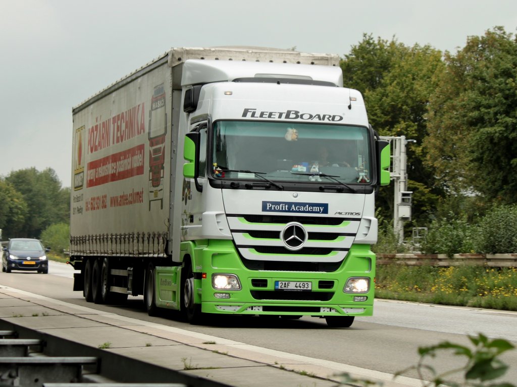 Mercedes Actros mit Planenauflieger am 12.08.2011 auf der A4 kurz hinter der Niederländischen Grenze.