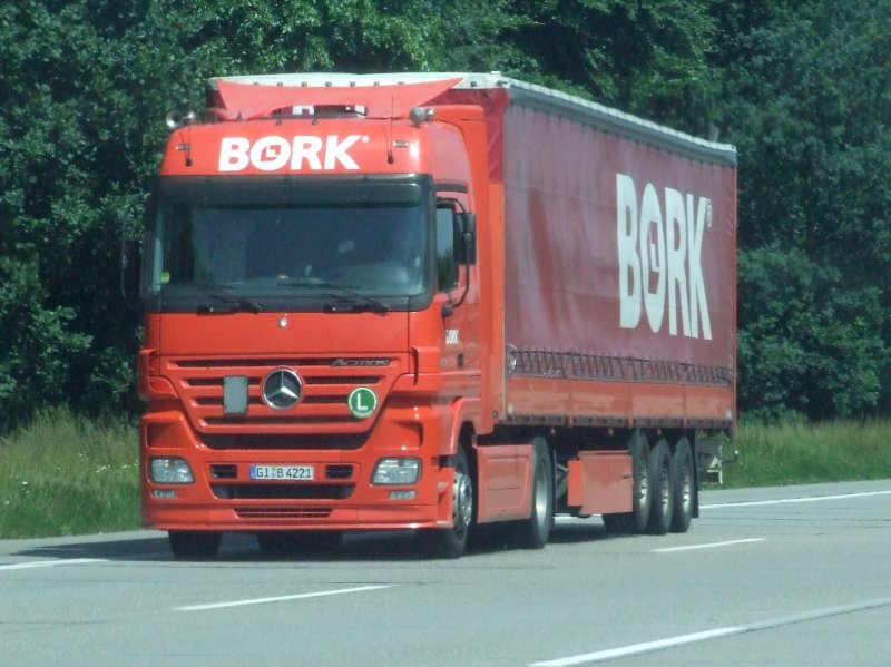 Ein BORK Actros Megaspace ist am 11.06.2008 auf der A5 in Richtung Süden unterwegs.