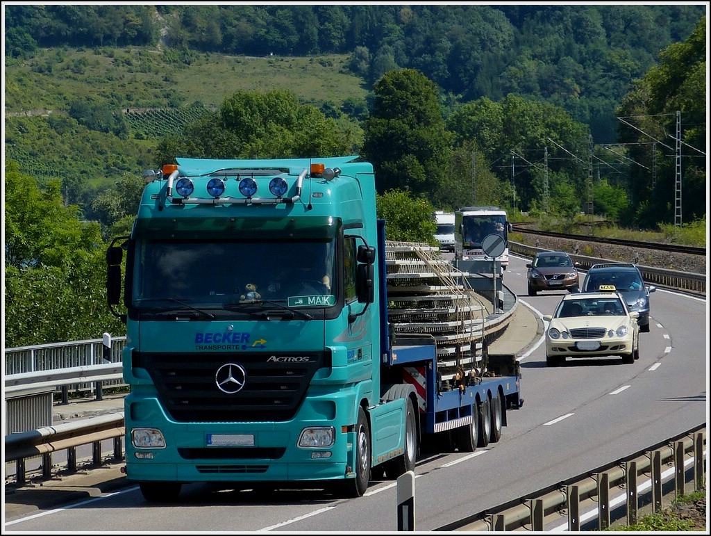 M-B Actros Sattelzug mit Betonfertigteilen beladen, aufgenommen am 10.08.2012.