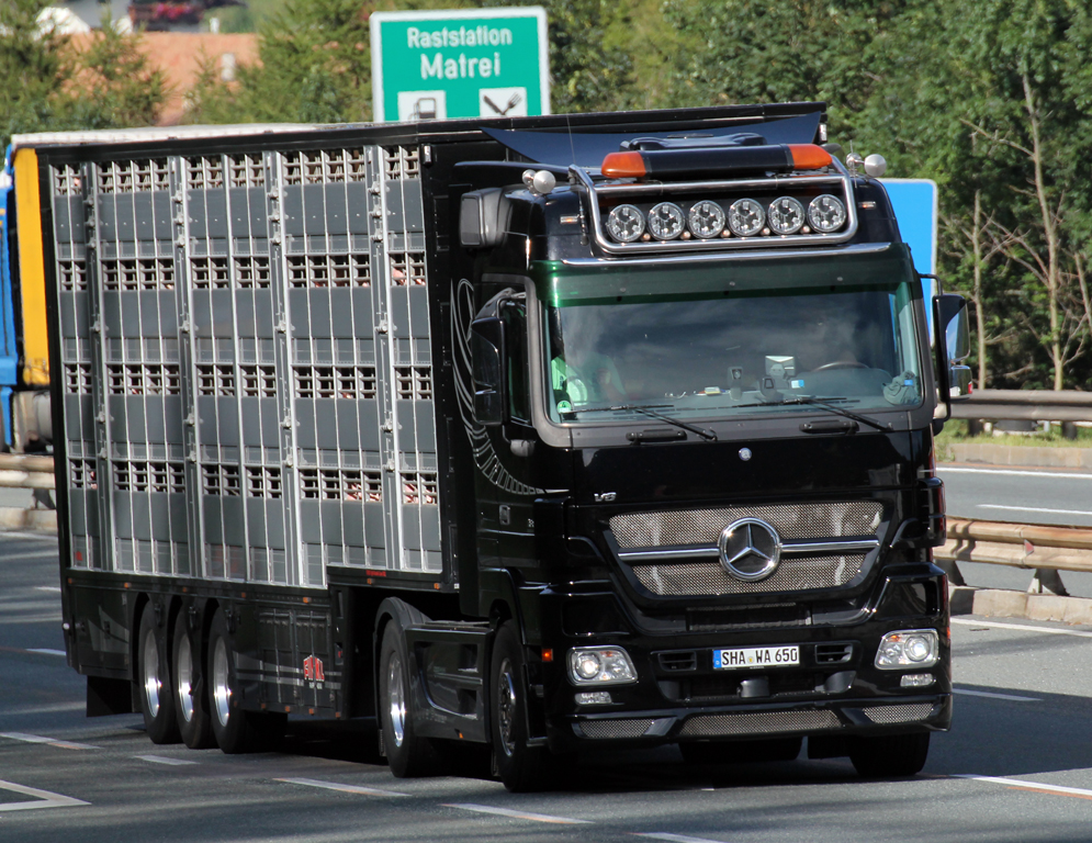 Da kam doch gleich doppelte Freude auf: Zum einen einen LKW aus meinem Heimat-Landkreis fernab davon erwischt und dann noch dazu einen selten anzutreffenden MB Actros 1861 "Black Edition", hier unterwegs als Viehtransporter auf der Brennerautobahn in Richtung Italien. Die "Black Edition" war eine limitierte Sonderserie anlässlich des 10-jährigen Actros-Jubiläums im Jahr 2006. Es wurden gerade einmal 250 Stück davon gebaut, von denen 100 für den deutschen Markt und die restlichen 150 für den übrigen europäischen Markt bestimmt waren. Neben dem luxoriös ausgestatteten Arbeitsplatz des Fahrers zeichnete sich die "Black Edition" auch durch die starke V8-Maschine mit 612 PS aus. Aufnahmedatum 28.08.2012