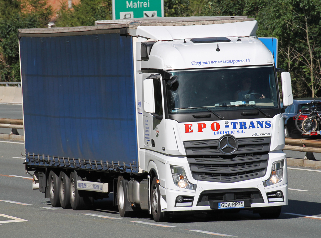 MB Actros 1845 von "EPO-Trans" aus Polen ist auf der Brennerautobahn in Richtung Süden unterwegs, 28.08.2012