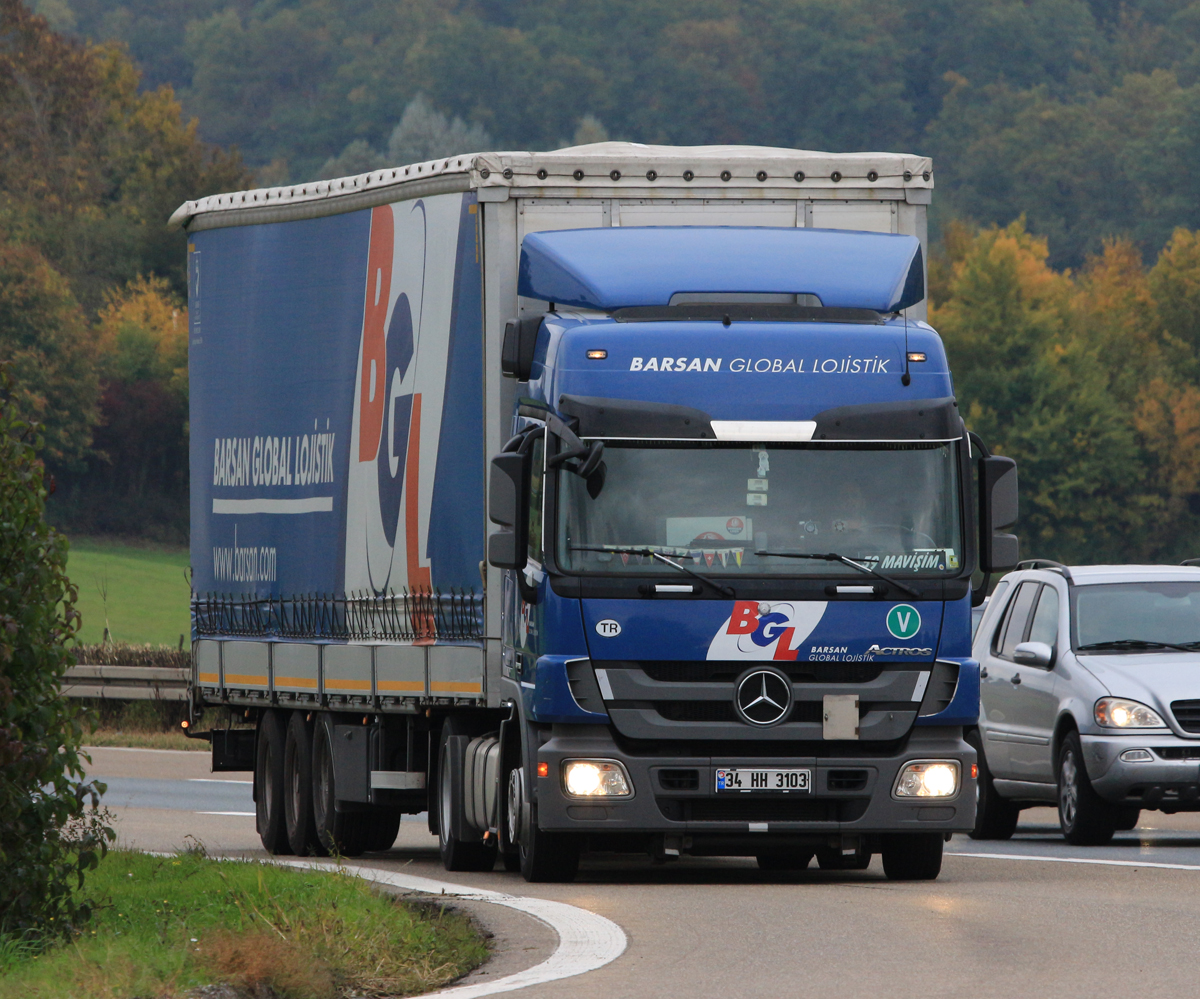 MB Actros MP3 "BGL Barsan Global Lojistik" aus der Türkei verlässt die BAB 6 für eine Pause auf einem Parlplatz, 16.10.2013