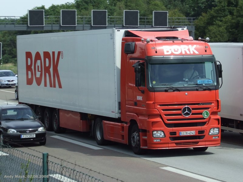 Ein BORK Mercedes-Benz Actros (MpII) auf der A5 beim Frankfurter Flughafen in Richtung Süden am 07.08.2008.
