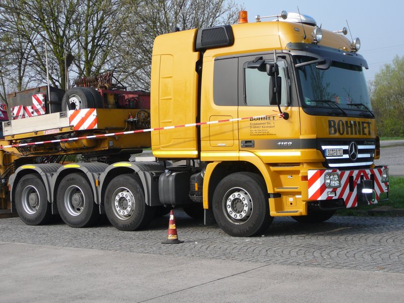 MB 4160 der Spedition Bohnet als Zugmaschine für einen Spezialtransport, gesehen auf einem Rastplatz an der A5, 06.04.2009