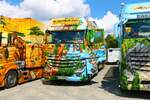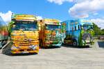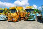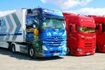 =MB Actros-Sattelzugmaschine des Schaustellerbetriebes KÜCHENMEISTER steht auf dem Weinfestgelände von Bernkastel-Kues, 08-2023