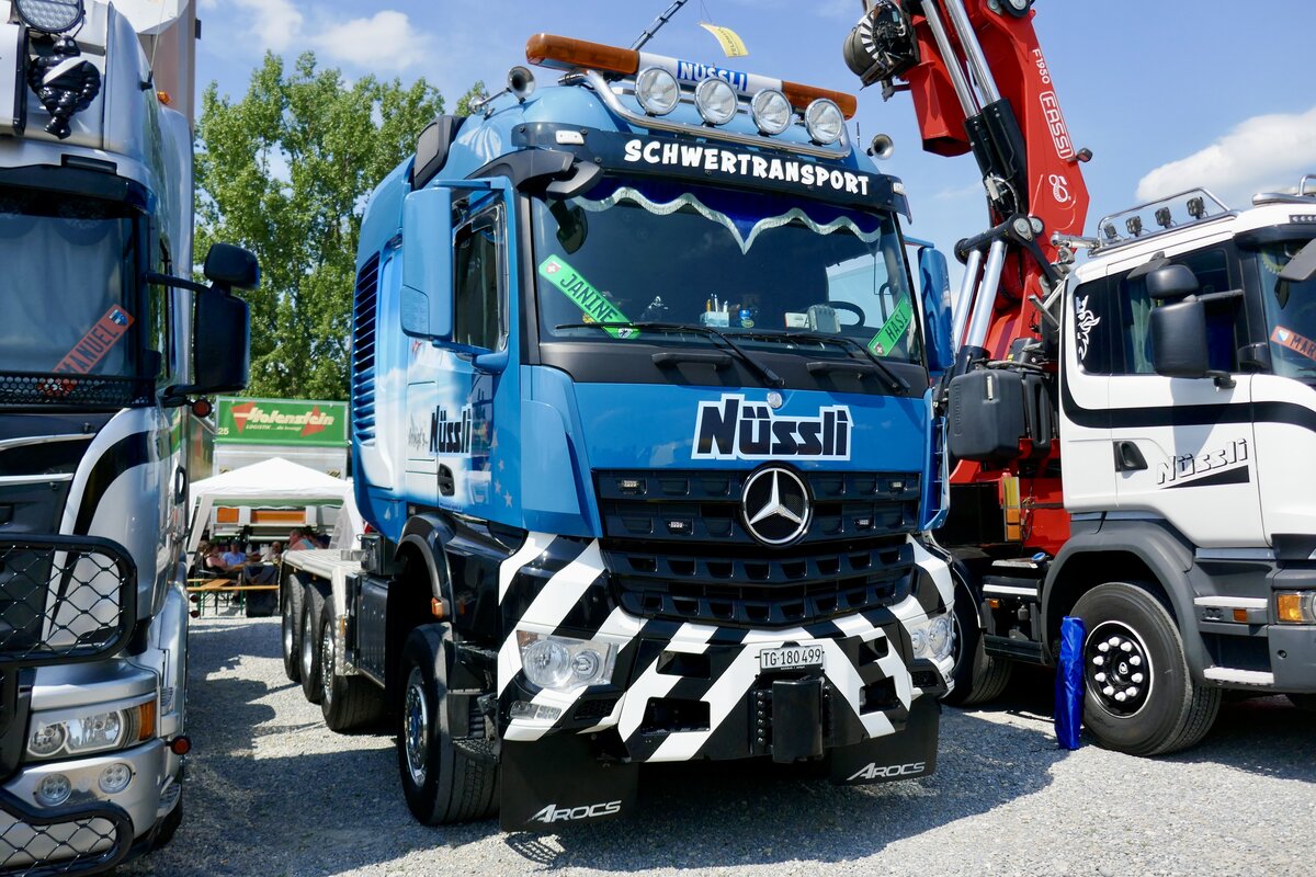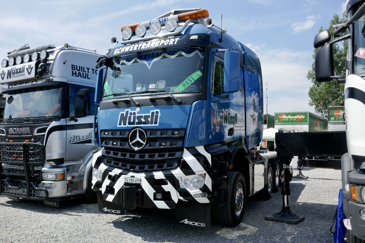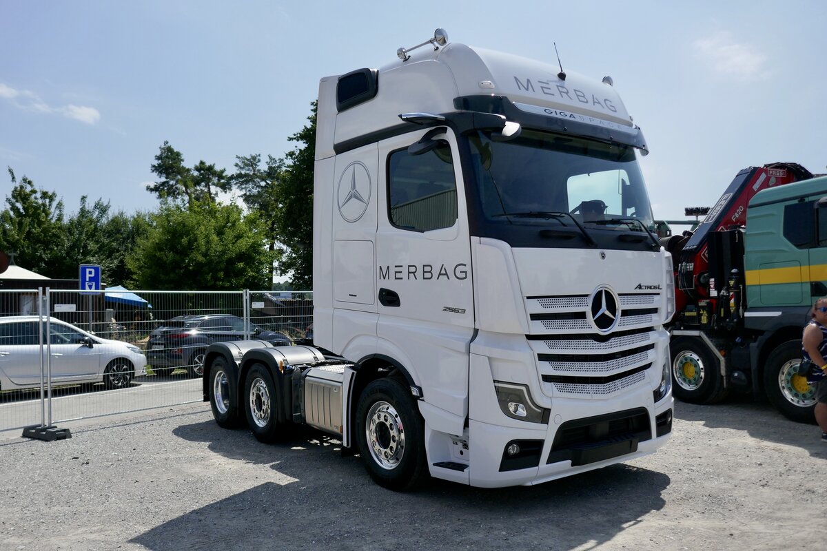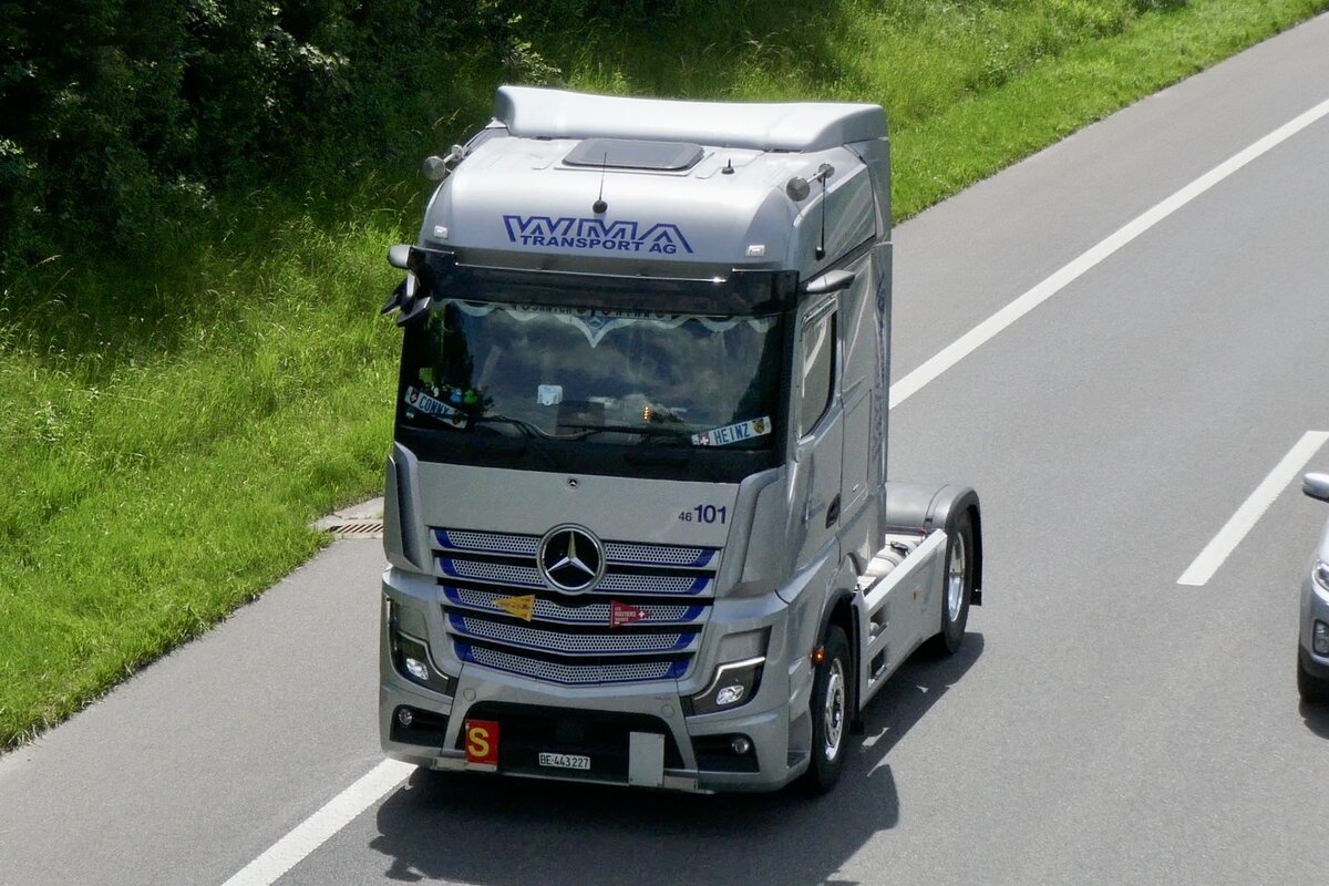Eine MB Actros Zugmaschine von WMA Transport und Betrieben durch Baltensperger am 28.6.24 auf der A8 in Matten b. Interlaken.