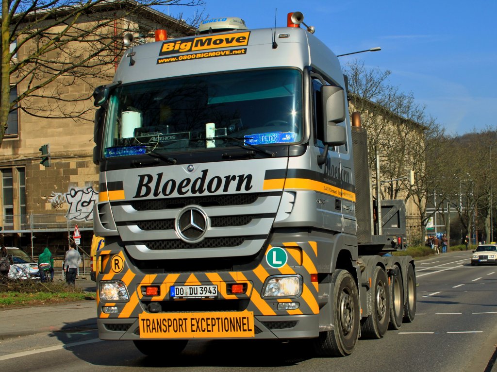 Actros 4160 der Spedition Bloedorn "BIG MOVE" verläßt am 16.03.2012 eine Baustelle in Aachen.