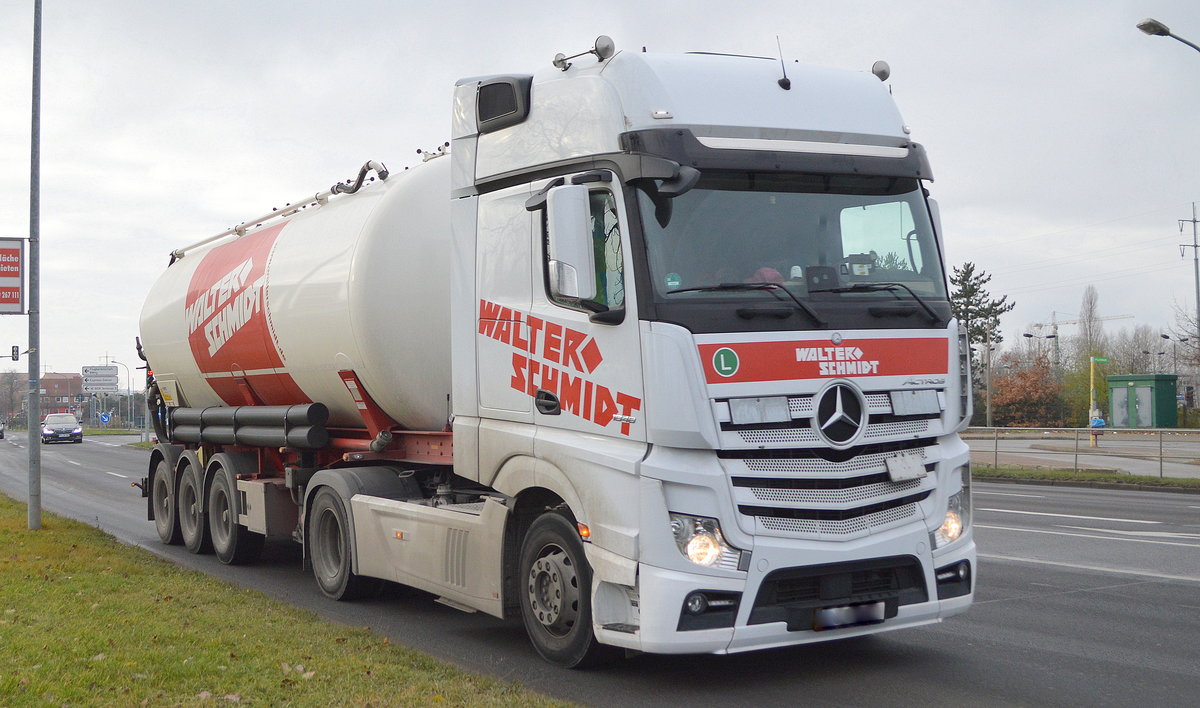 Walter Schmidt Logistik GmbH mit einem Siloauflieger mit MB ACTROS 1848 Zugmaschine am 16.12.20 Schönefeld b. Berlin.