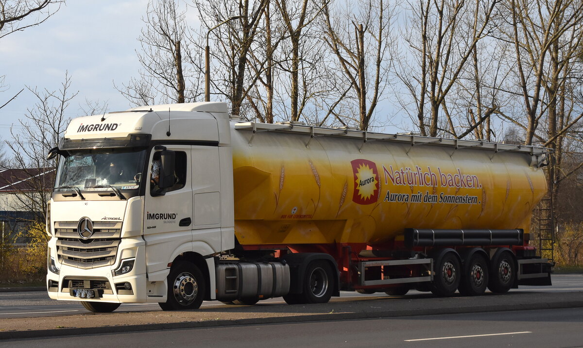 Imgrund Silogistic GmbH mit einem Siloauflieger Sattelzug für Mehltransporte mit MB ACTROS L 1848 Zugmaschine am 12.03.24 Berlin Marzahn.