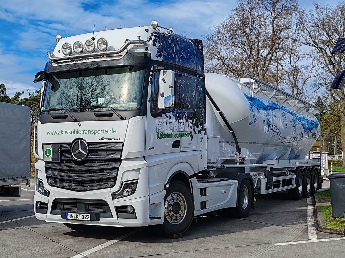 =MB Actros L der Spedition KIENZLE, einer Fachfirma zum Transport von Aktivkohle, steht im Februar 2024 auf dem Rasthof Fulda-Nord