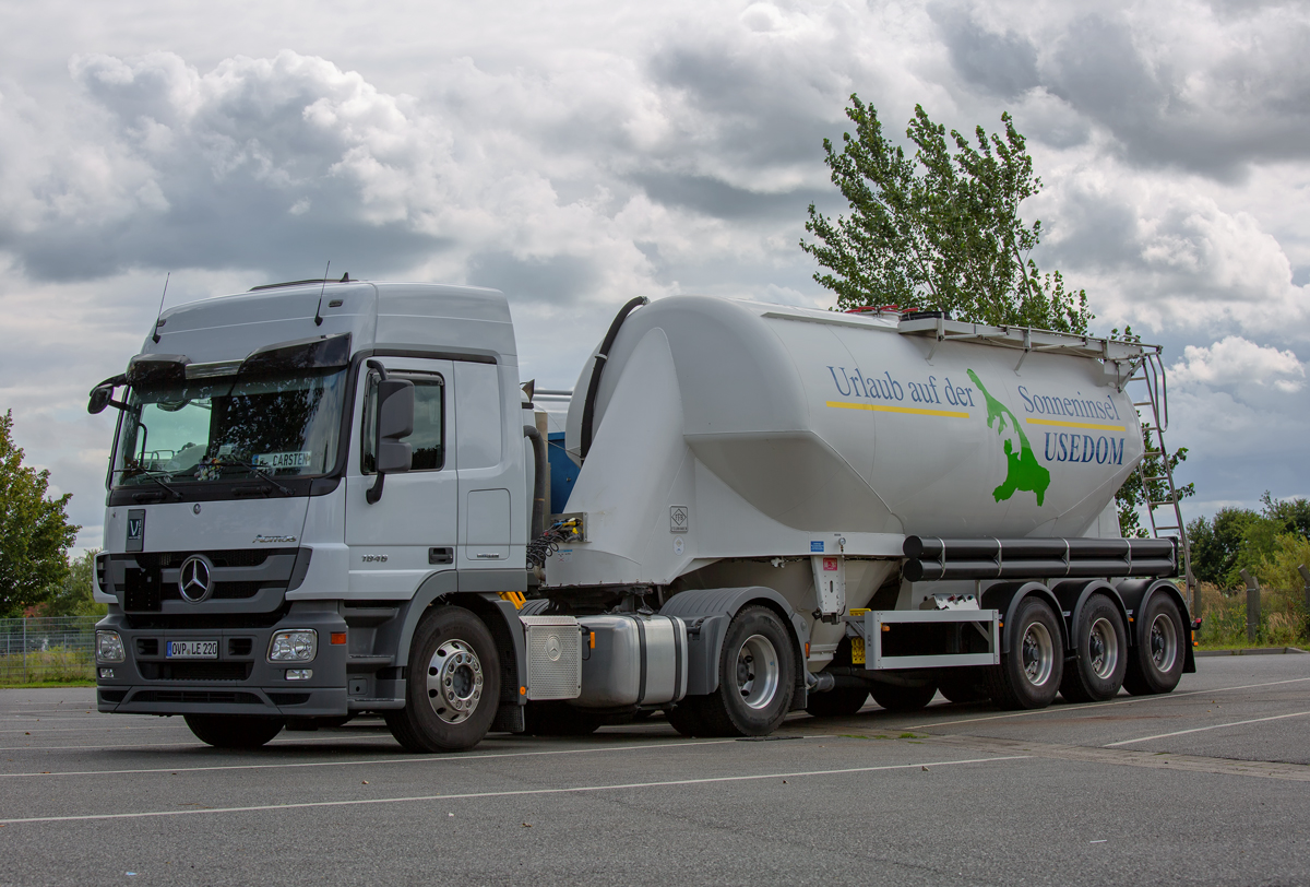 MB ACTROS 1846 mit FELDBINDER Silosattelanhänger EUT 35.3 der für „Urlaub auf der Sonneninsel Usedom“ wirbt. - 16.08.2014