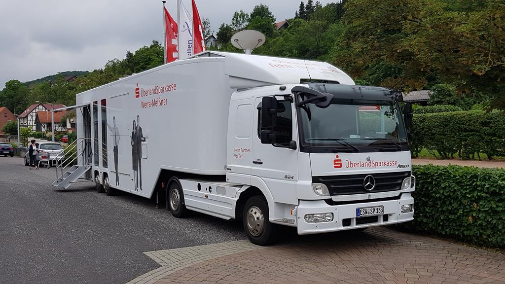 Mercedes Benz Atego mit Kreissparkassen Sattel Aufbau am 15.06.2018 in Dotterode.