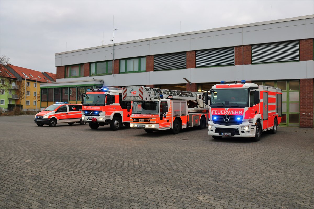 Feuerwehr Aschaffenburg erweiterter Löschzug mit Mercedes Benz Vito KdoW (Florian Aschaffenburg 1/12/), Mercedes Benz Atego HLF1 (Florian Aschaffenburg 1/40/1), IVECO DLK1 (Florian Aschaffenburg 1/30/1) und Mercedes Benz Antos TLF1 (Florian Aschaffenburg 1/32/1) am 14.12.18 bei einen Fototermin