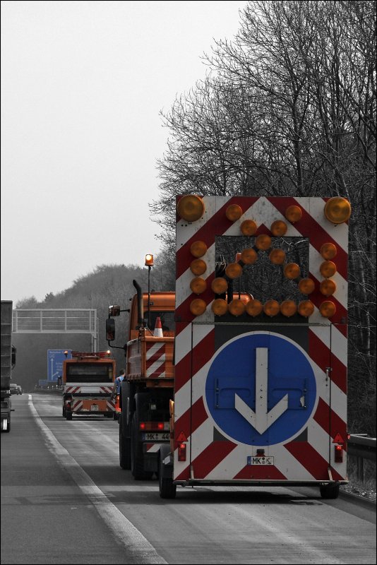 Die anderen Kollegen entleeren die Wassereinläufe (Fangschlammeimer) auf der A45 Im Bild fahrbare Absperrtafel mit Atego 1828 und Sprinter 211CDI mit Hänger. Hier kurz vor Schwerte-Ergste...