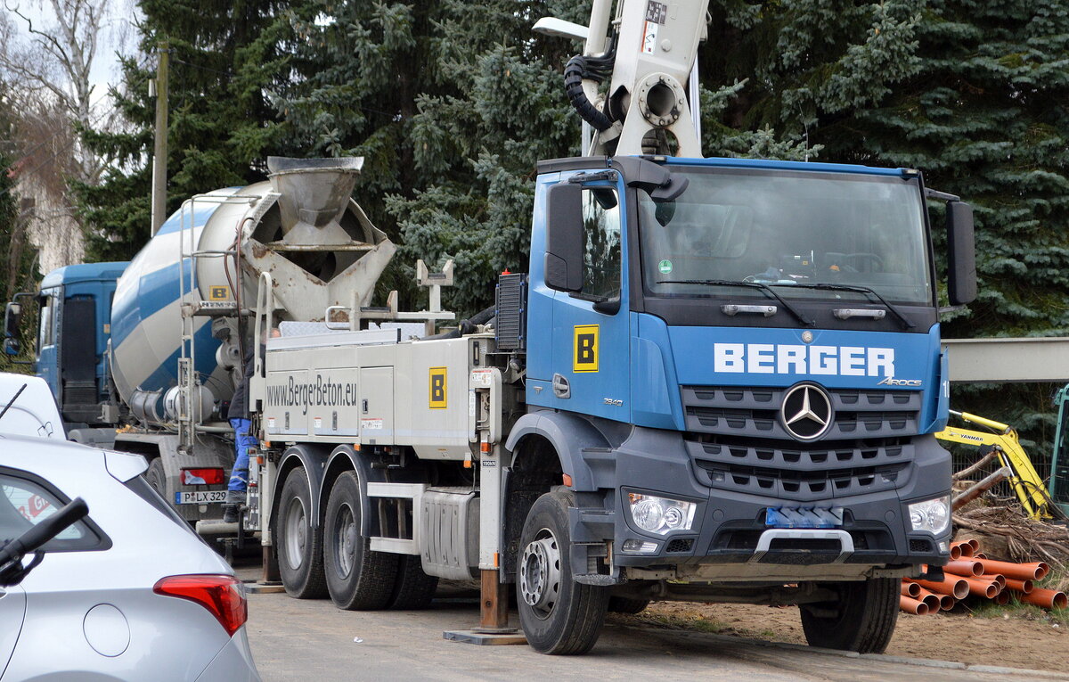 BERGER HOLDING SE mit einem MB AROCS 2840 und einer SCHWING S 36 X Betonpumpe als Aufsatz am 06.04.22 im Einsatz in Golm (Potsdam).