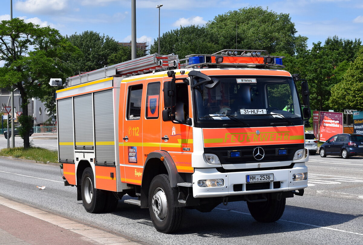 Ein HLF 20/16, Fahrgestell eines MB Atego 1629 AF der Hamburger Feuerwehr (BF Harburg, 31-HLF-1) nach Einsatzfahrt zurück zur Wache am 27.05.24 Walter-Dudek-Brücke Hamburg-Harburg.