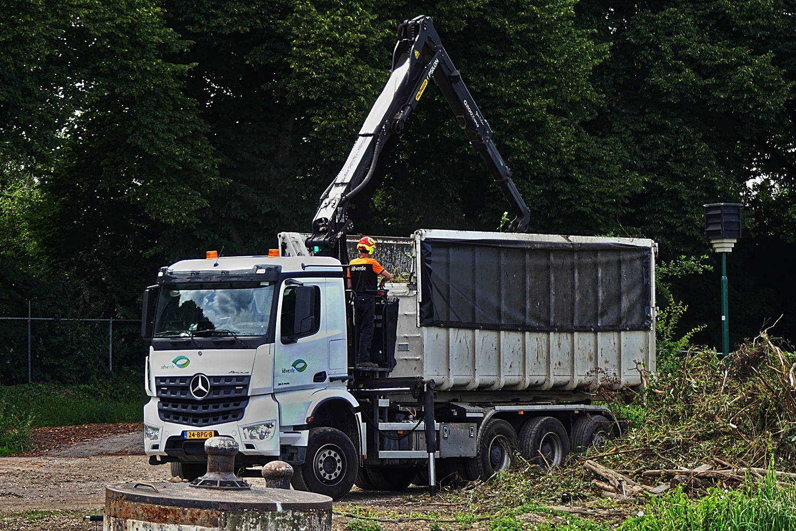 Mercedes Benz Absetzkipper und Verladegreifer, am Ufer der Maas beim Verladen von Sturmholz welches an dieser Stelle aus dem Fluss gefischt wurde. 07.2024