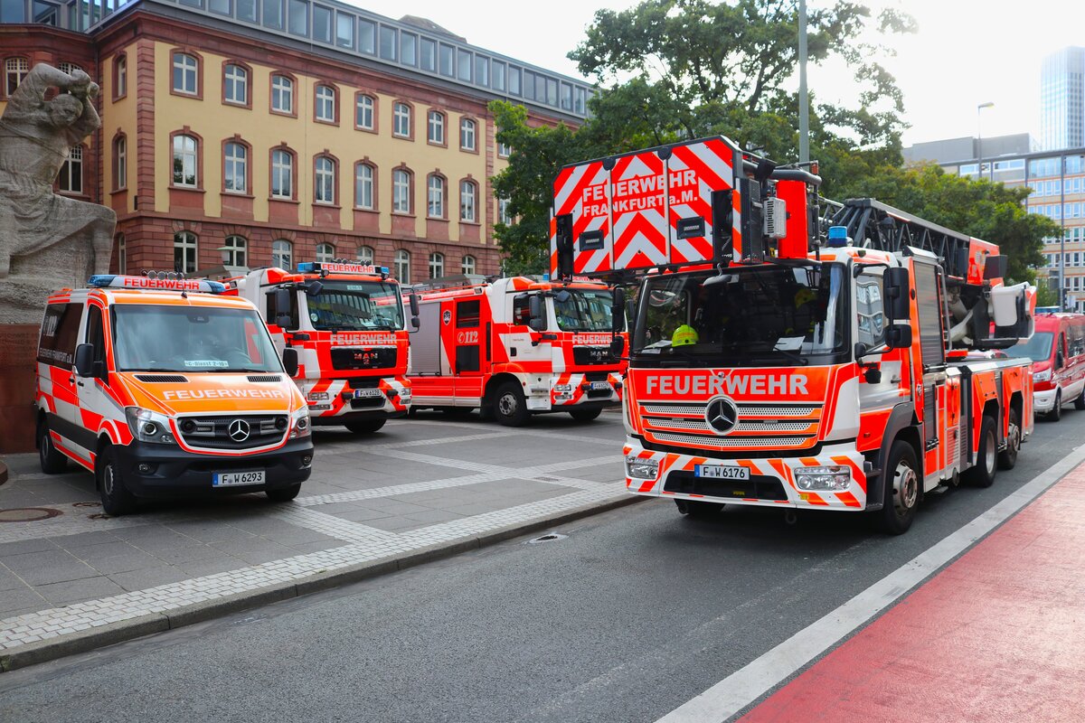 Berufsfeuerwehr Frankfurt Löschzug Wache 2 mit Mercedes Benz Sprinter ELW C-Dienst, MAN TGM HLF20/16 und Mercedes Benz Atego DLK23/12 am 28.09.24 beim Tag des Selbstschutzes in Frankfurt Innenstadt