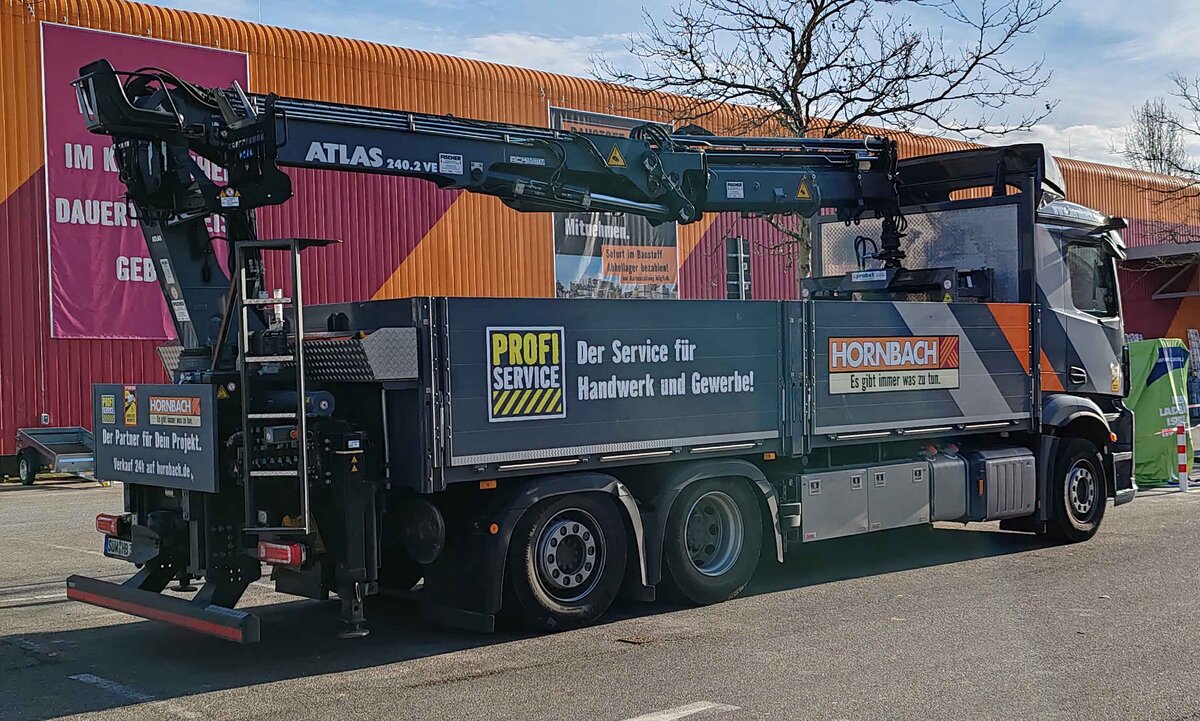 =MB-Kranfahrzeug der Baumarktkette HORNBACH mit ATLAS-Ladekran steht im Januar 2025 in Karlsruhe