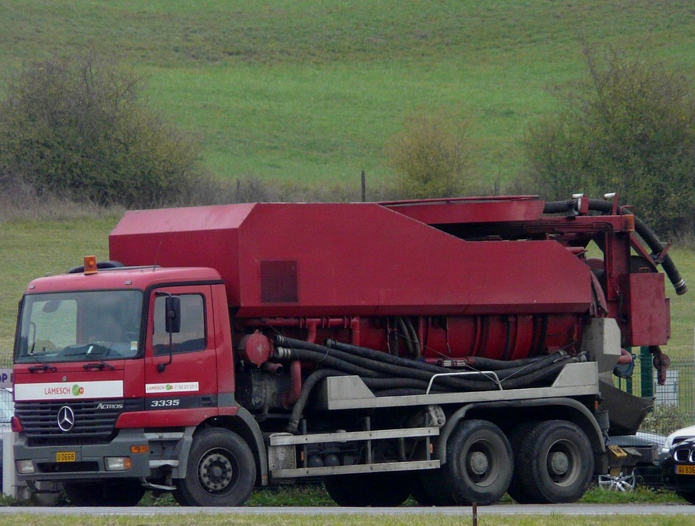 M-B Actros 3335 mit Sonderaufbau zur Abflusskanalreinigung auf dem chip festgehalten bei trübem Wetter am 24.10.2011.