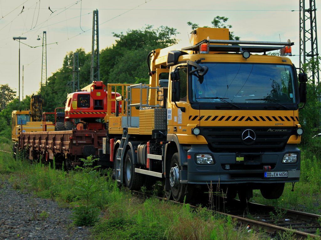Aufgegleistes Actros 3346 Zweiwegefahrzeug mit Wechselbrückenaufbau am 23.06.2012 in Aachen West.